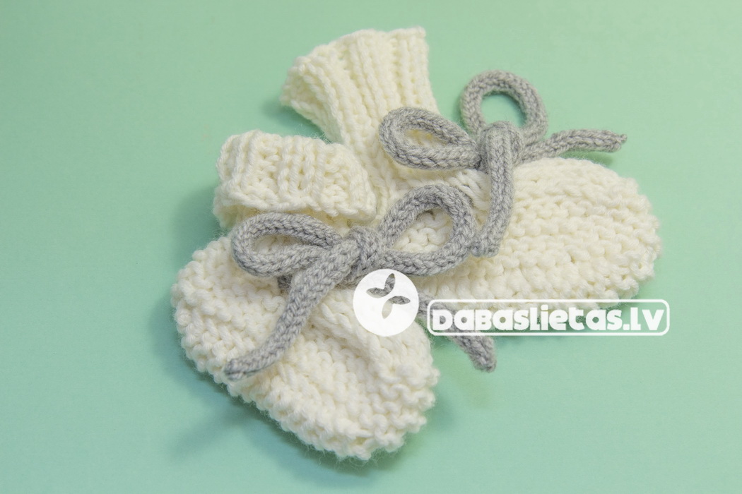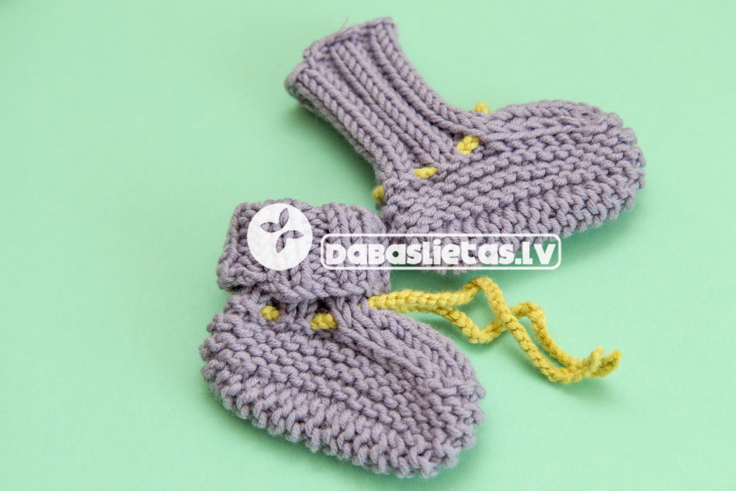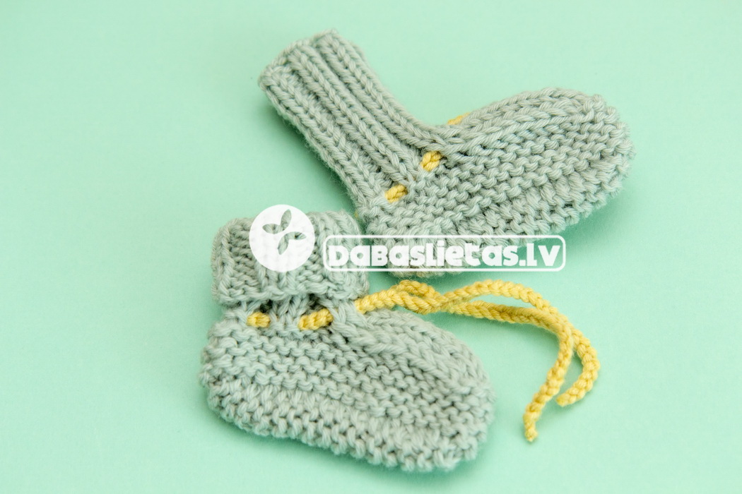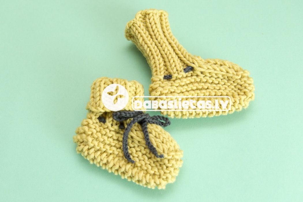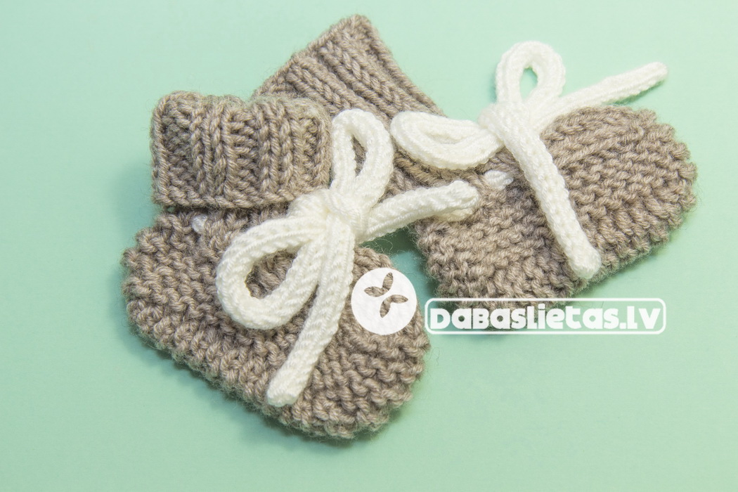 Adīti merino vilnas mazuļu zābaciņi darināti no maigas un siltas merino vilnas dzijas ar sasienamu aukliņu. Stimulē asinsriti uzvilktas uz plikām kājiņām. Izmērs no 0 līdz ~3 mēn., bet derēs arī ilgāk, elastīgas.