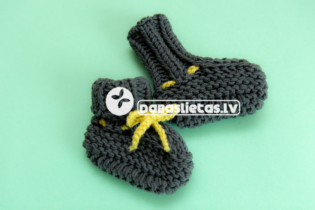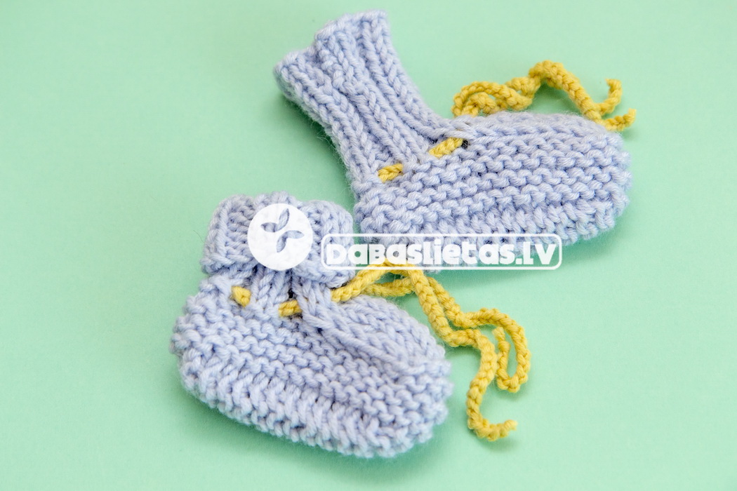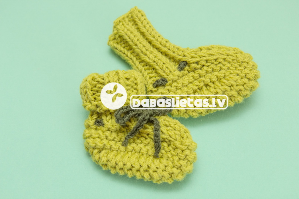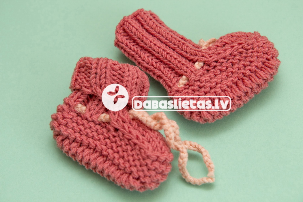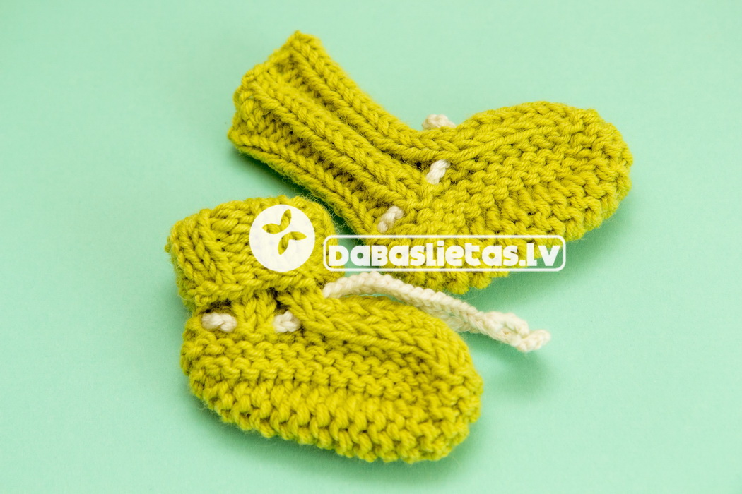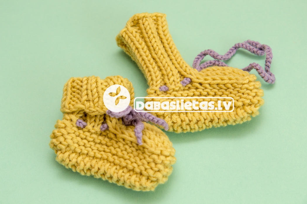 Adīti merino vilnas mazuļu zābaciņi darināti no maigas un siltas merino vilnas dzijas ar sasienamu aukliņu. Stimulē asinsriti uzvilktas uz plikām kājiņām. Izmērs no 0 līdz ~3 mēn., bet derēs arī ilgāk, elastīgas.