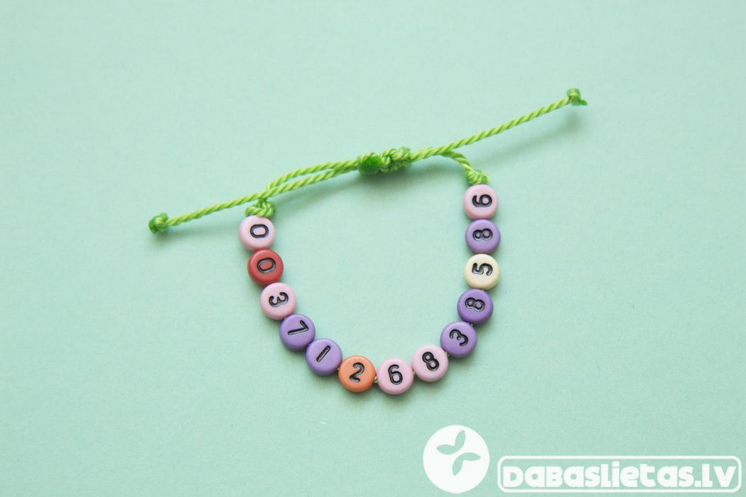 Telefona numurs tiek savērts no raibas krāsas cipariem uz zaļa striķīša. Rokassprādze savilktā stāvoklī turas cieši un pati neveras vaļā.