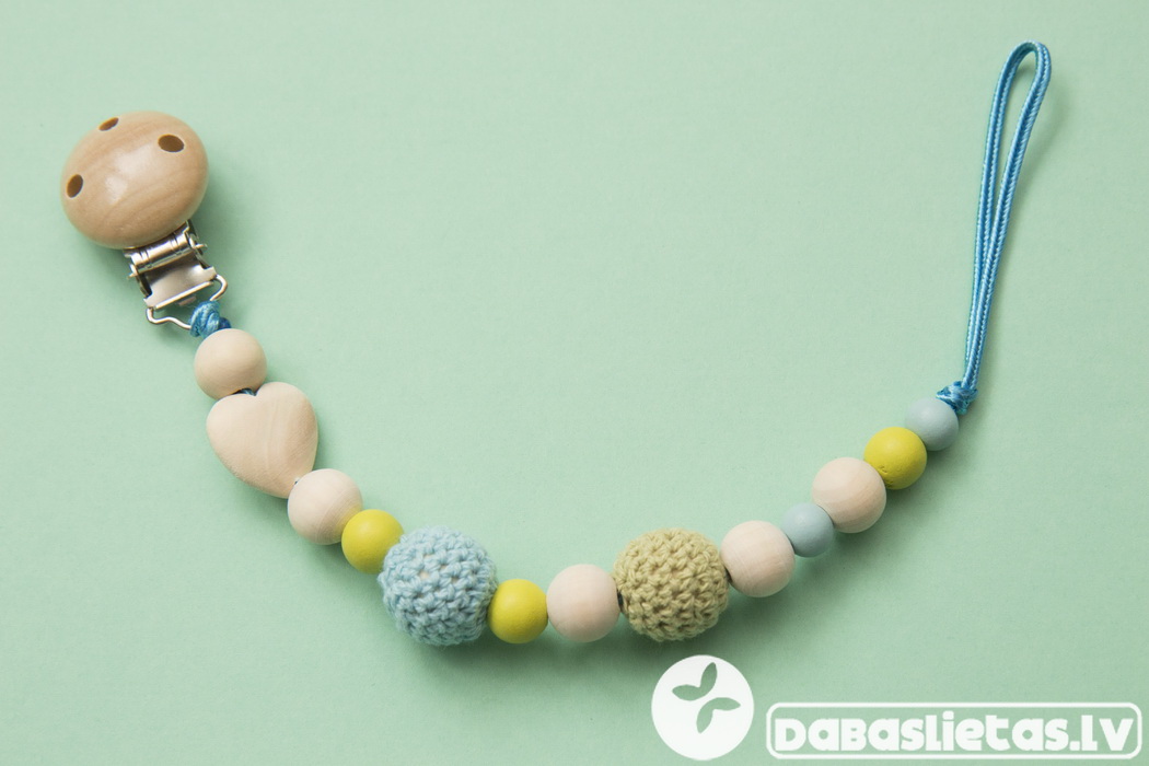 Izgatavots no ekoloģikām kļavas koka pērlītēm, aptamborēts ar kokvilnas diegu. Dažādas formas un faktūras koka bumbiņas attīstīs sīko motoriku, kas nozīmē arī valodiņas attīstību. Piemērots mazuļiem no dzimšanas.
