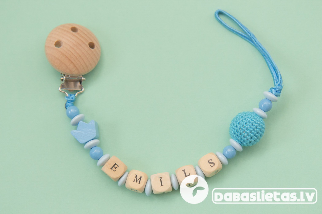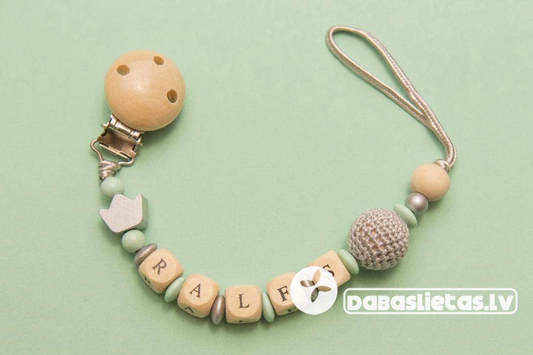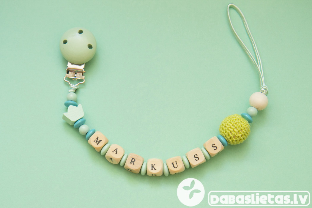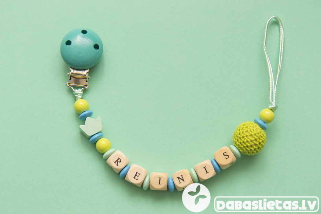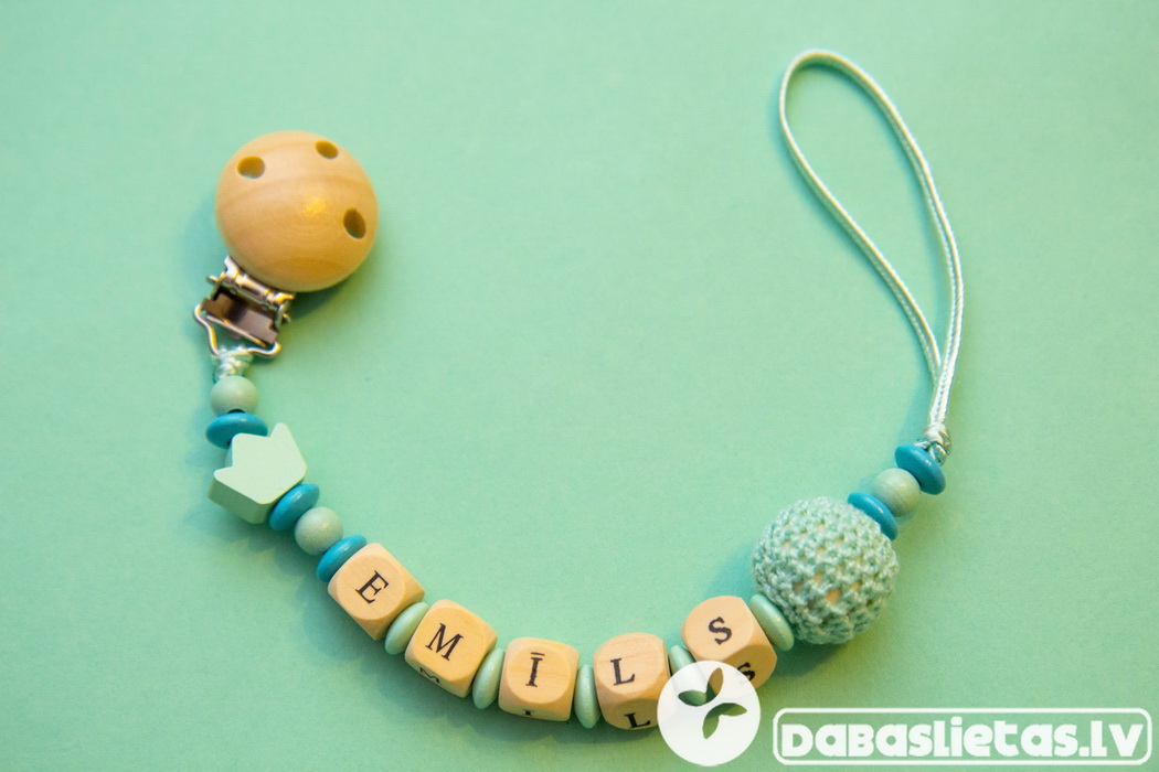 Izgatavots no augstākās kvalitātes Vācijā ražotām koka pērlītēm, atbilst visiem drošības standartiem, krāsots ar bērniem draudzīgu krāsu, nesatur toksīnus un ir mitrumizturīgs. Koka knaģis stingri turas un nebojā apģērbu, metāla detaļas nesatur niķeli. Kļavas koka pērlīte aptamborēta ar kokvilnas diegu. Dažādas formas un faktūras koka bumbiņas attīstīs sīko motoriku, kas nozīmē arī valodiņas attīstību.