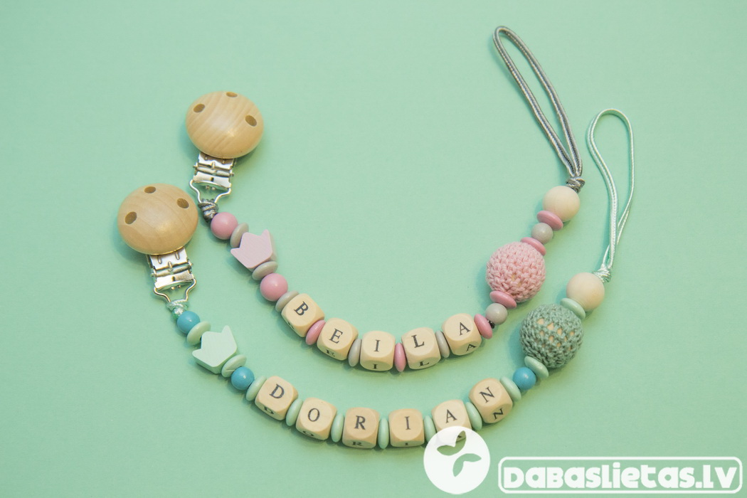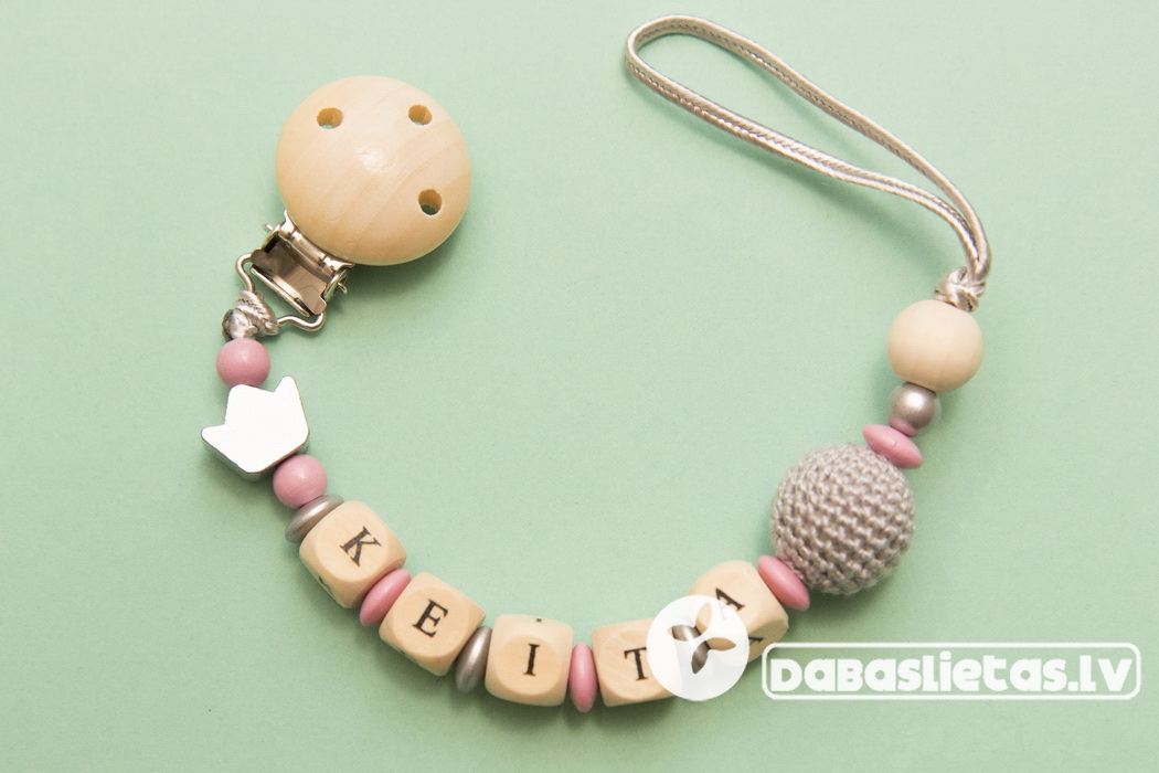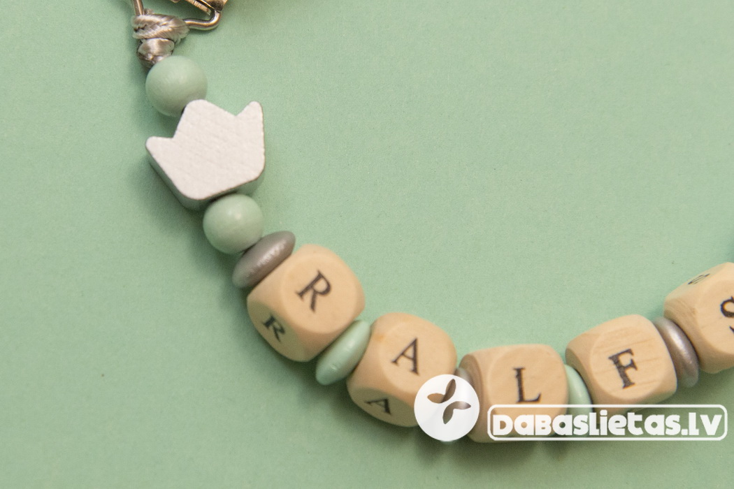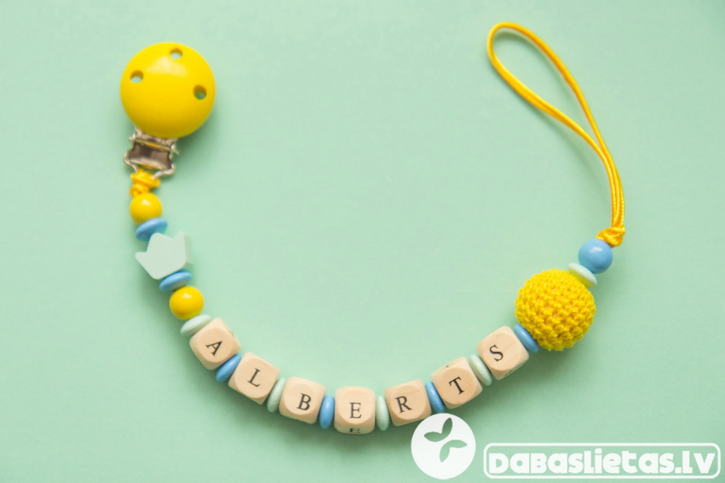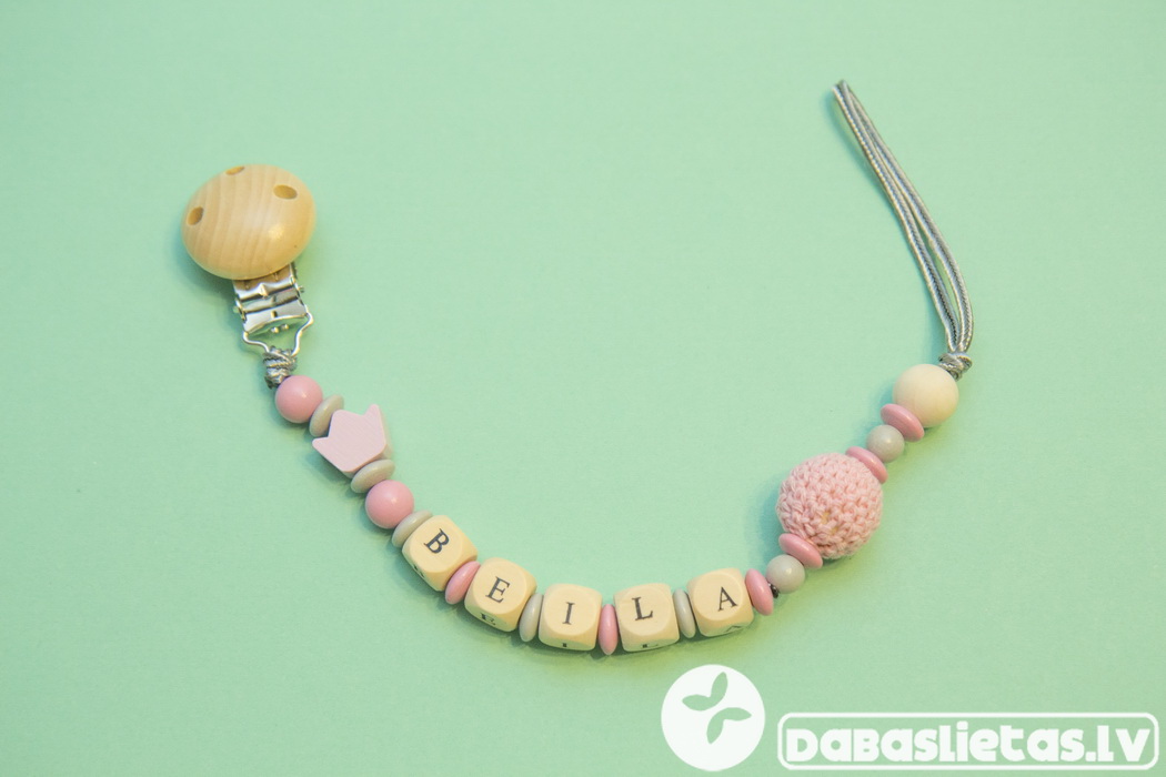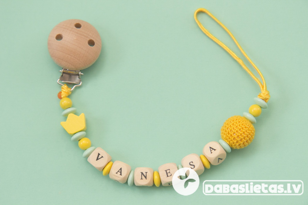 Izgatavots no augstākās kvalitātes Vācijā ražotām koka pērlītēm, atbilst visiem drošības standartiem, krāsots ar bērniem draudzīgu krāsu, nesatur toksīnus un ir mitrumizturīgs. Koka knaģis stingri turas un nebojā apģērbu, metāla detaļas nesatur niķeli. Kļavas koka pērlīte aptamborēta ar kokvilnas diegu. Dažādas formas un faktūras koka bumbiņas attīstīs sīko motoriku, kas nozīmē arī valodiņas attīstību.