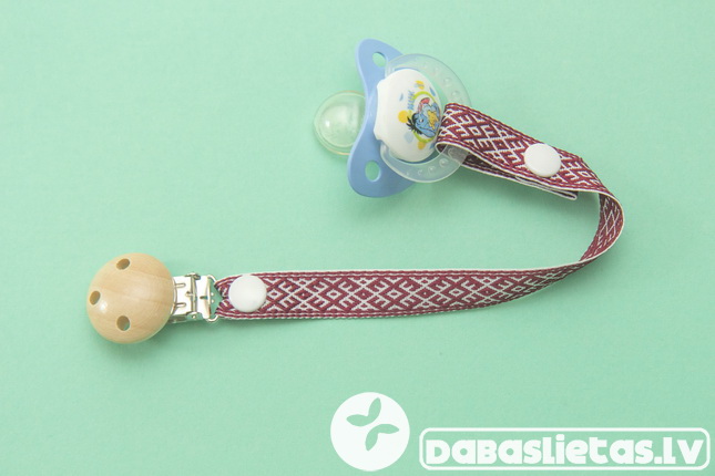 Skaists, lakonisks un ļoti praktisks aksesuārs neļaus māneklītim nokrist un nozust. Dabīga koka knaģis stingri turās, nebojājot apģērbu, drošs aukliņas garums. Spiedpogas stiprinājums ļaus acumirklī uzlikt un noņemt knupīti. Var stiprināt arī jebkuru citu aksesuāru un graužamriņķi pie apģērba, ratiem, vai lacītes. Atbilst drošības standartiem: EN 12586; EN 71-E.