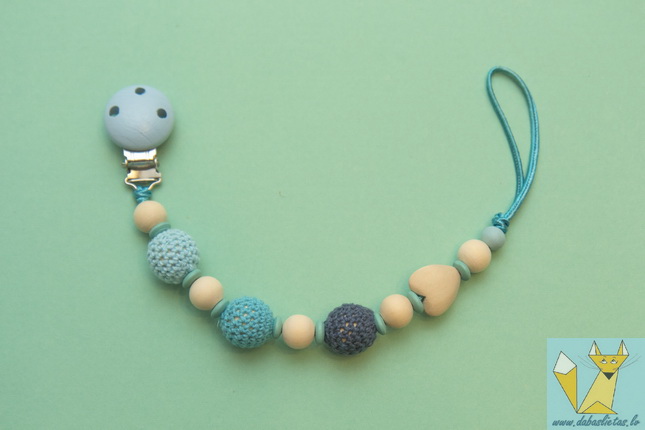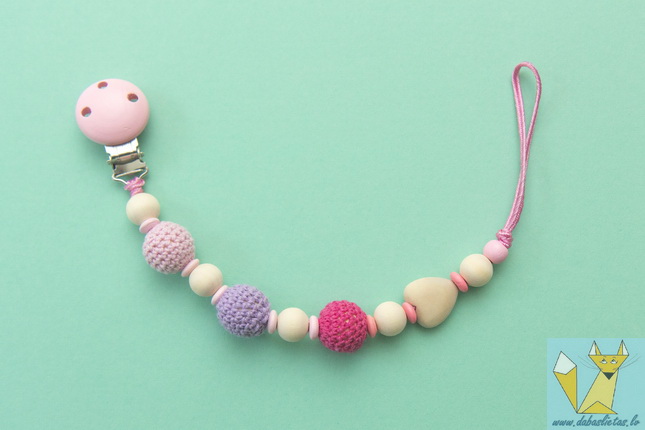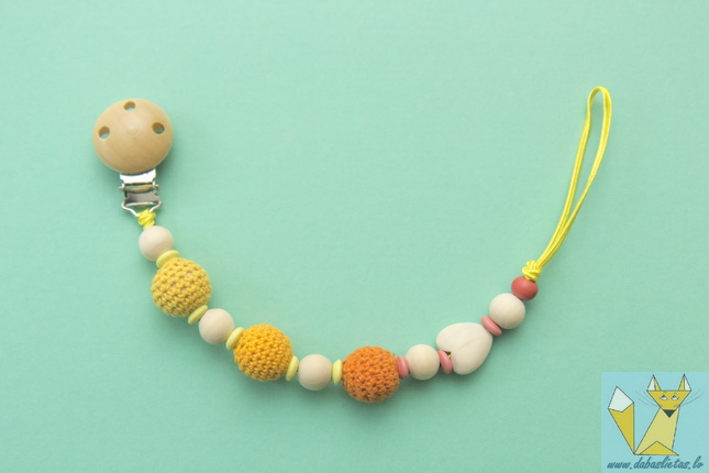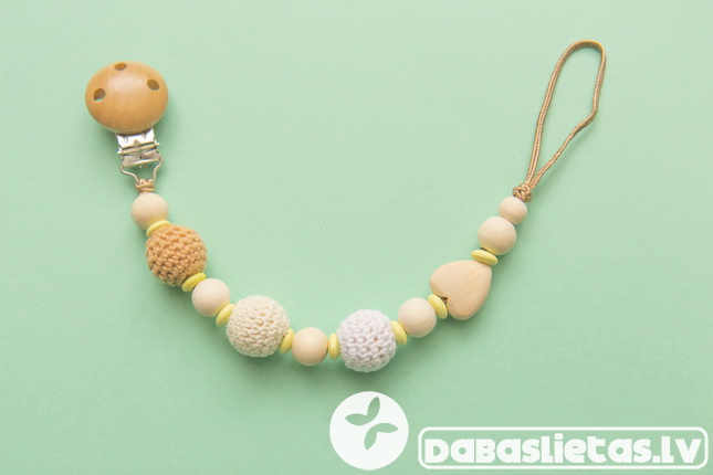 Koka knupīša turētājs ar vārdu izgatavots no ekoloģiskām neapstrādāta kļavas koka pērlītēm, ar kokvilnas diegu aptamborētām koka pērlītēm un augstākā labuma krāsotām koka detaļām, kas pārklātas ar bērniem draudzīgu krāsu, nesatur toksīnus, mitrumizturīgas. Atbilst drošības standartiem: EN 12586; EN 71-E.