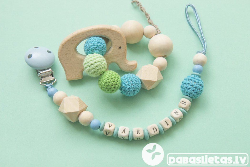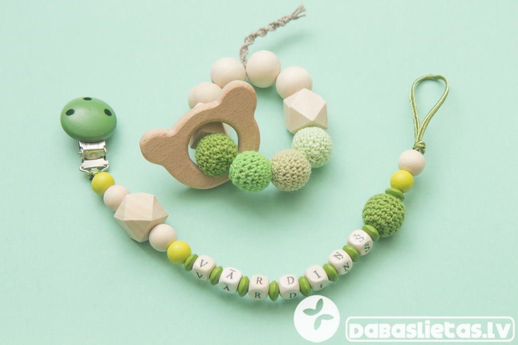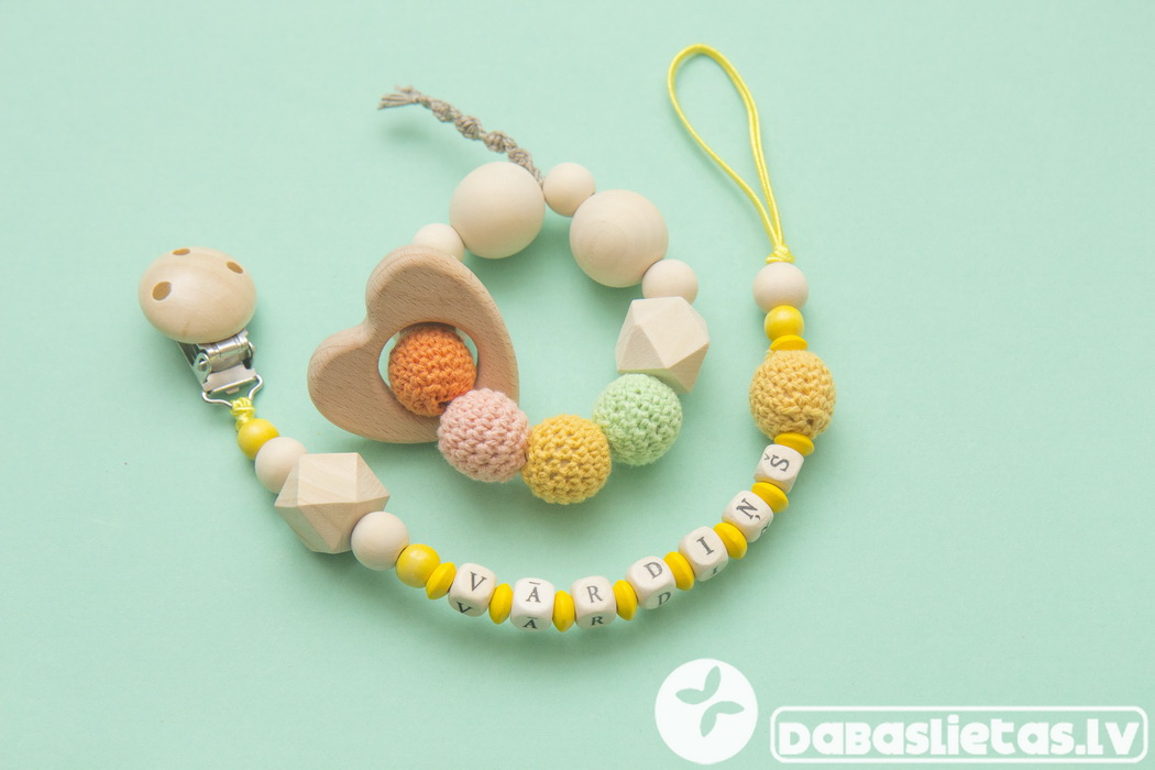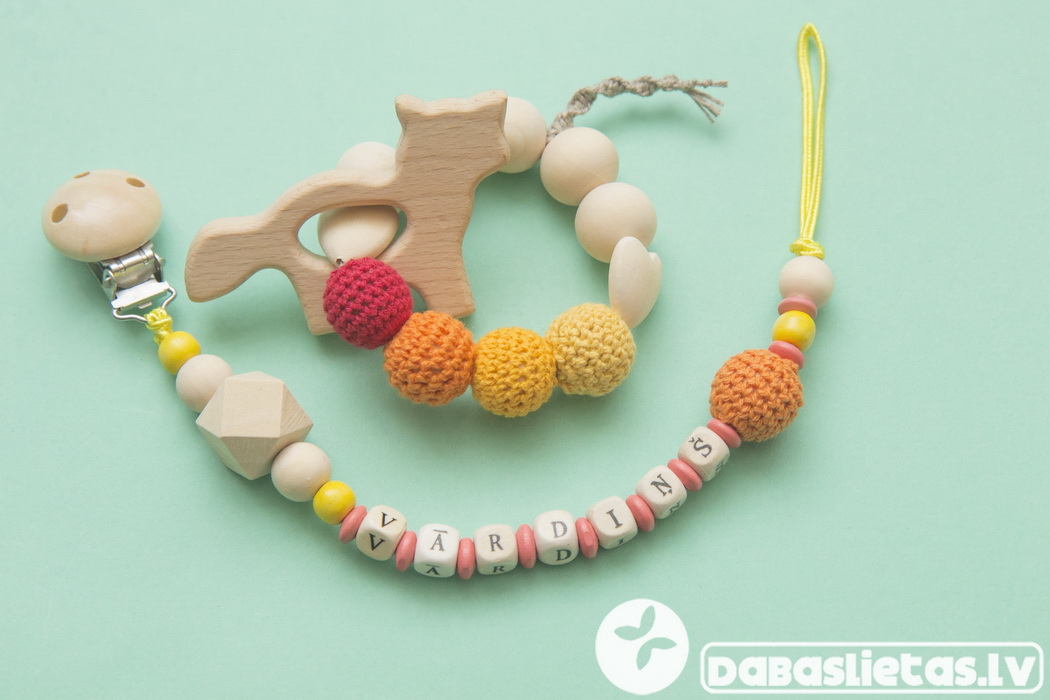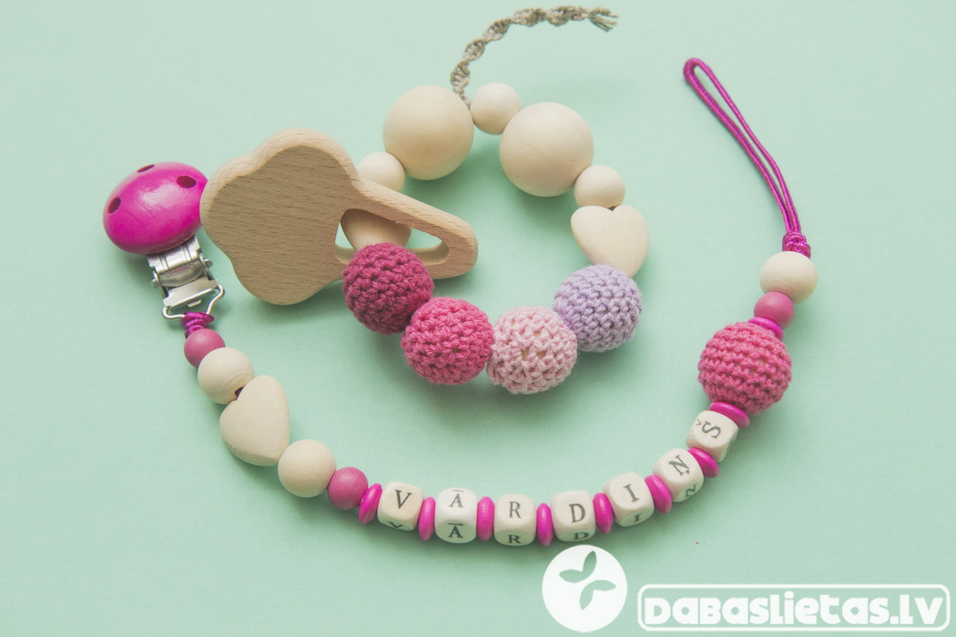 Koka knupīša turētājs ar vārdu, aptamborētu un koka sirsniņas formas dekoratīvo bumbiņu. Komplektā ar pieskaņotas krāsas un formas bumbiņu graužamriņķi.