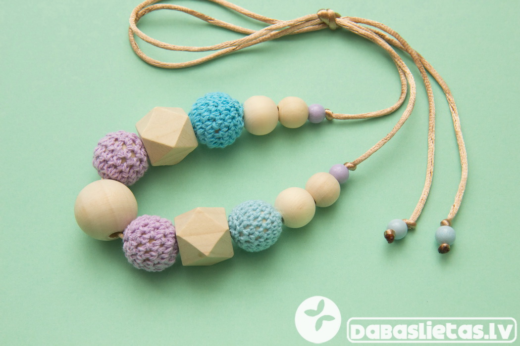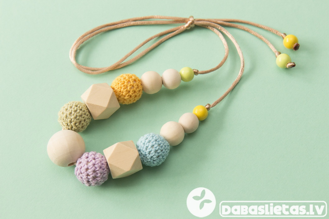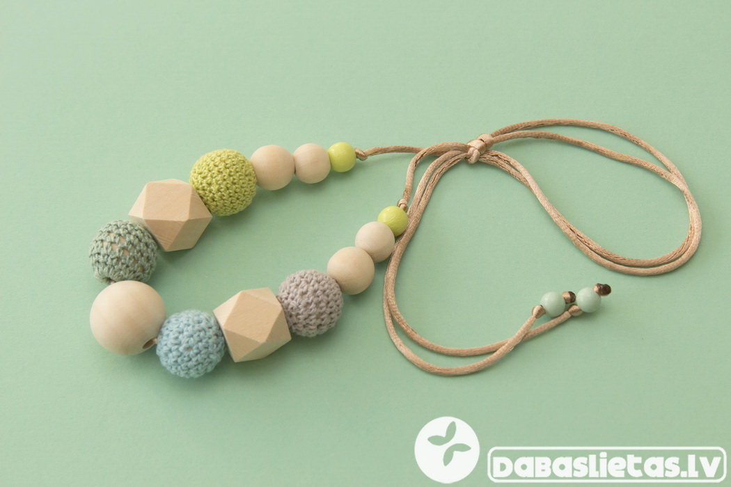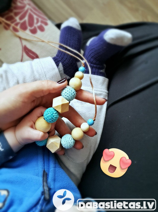 Noderīga lieta mammai barojot bērnu ar krūti, nēsājot slingā, vai apmeklējot veikalu ar mazuli rokās. Bērniņam būs ko izpētīt, pagrauzt un nomierināties mammas klātbūtnē. Dažādas formas un faktūras koka bumbiņas attīstīs sīko motoriku, kas nozīmē arī valodiņas attīstību.
